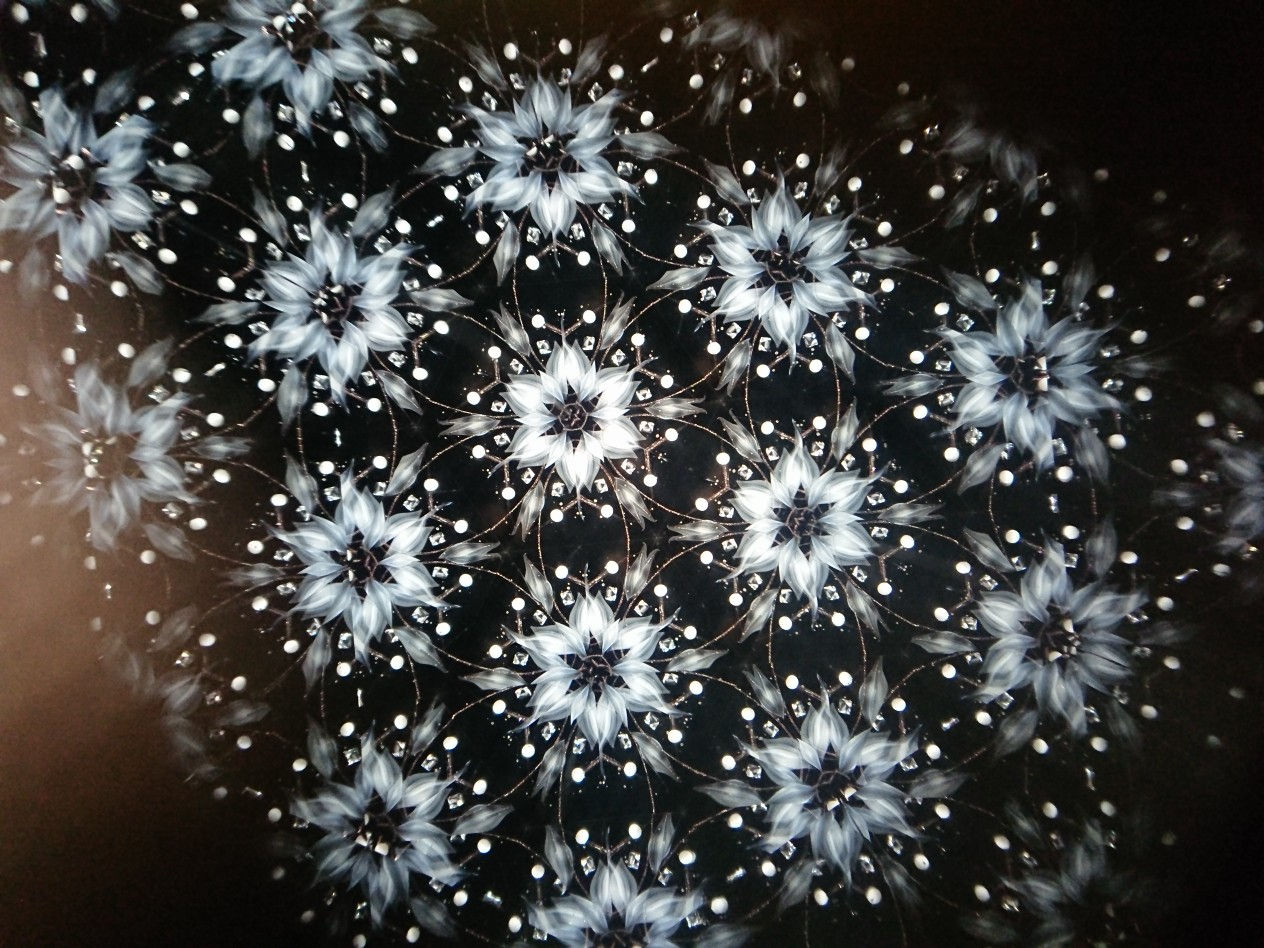6ポイントの3ミラーを組むには、頂角30度の二等辺三角形に組むやりかたと、30度・60度・90度の直角三角形に組むやりかたがあります。前者は基本の6ポイントのモチーフが崩れながら広がっていく映像になり、後者は基本の6ポイントのモチーフが(理屈の上では)無限に広がっていく映像になります。